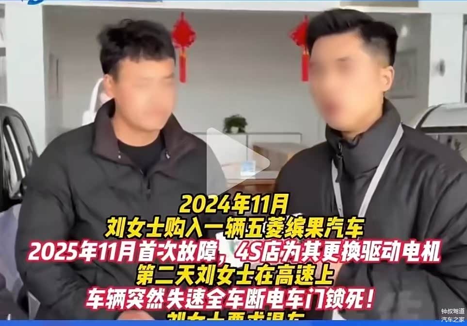 事发2025年11月,刘女士一家三口,开着一辆2024年11月购买的 五菱缤果(图片 | 参数 | 询价)行驶在高速公路之上。这辆车车龄刚满一年,并且头一天还在4S店更换过驱动电机,解决了原有的问题,任谁都不会担心这样的车辆会这么快出现故障。