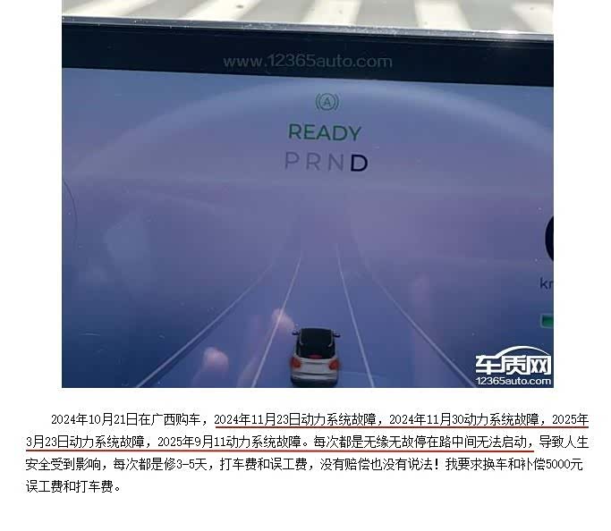 2024年10月21日购车的广西用户,在11月23日、11月30日,2025年3月23日、9月11日都出现了动力系统故障,车辆都是无缘无故停在路中间无法启动。