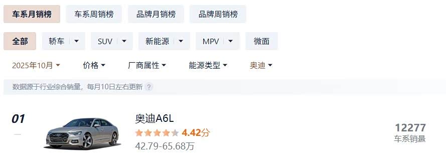 最后,我们再来看一下奥迪A6L的销量,该车在今年10月份卖出了12277台,而奥迪在10月份销量过万的车型只有两款,除了奥迪A6L外,还有奥迪Q5L,这两款车可以说是奥迪在国内市场最重要的拳头产品,销量的好坏,直接决定了奥迪在中国市场的地位。