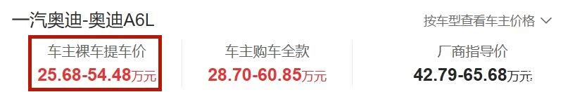 价格方面,奥迪A6L售价42.79-65.68万元,车主提车价为25.68-54.48万元,标配车型的价格优惠了17.11万元,优惠力度还是很大的。当然,我觉得这样的优惠力度应该是包含了国补或省补的,这也是这款车近几年来的价格低点,今年买车确实要比前两年更便宜一些。