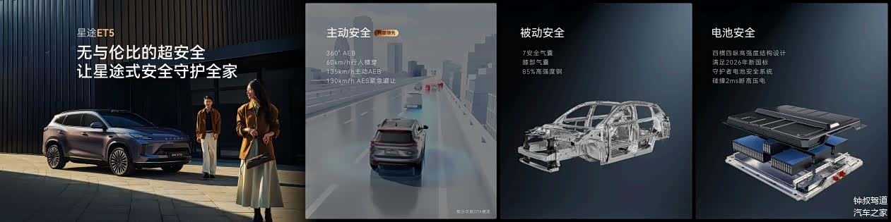新能源车型的安全始终是大家关注的核心,“超安全”是星途 ET5 对用户的核心承诺。星途 ET5 构建了“主动 + 被动 + 电池”的三重安全体系,安全标准远超新版国标。