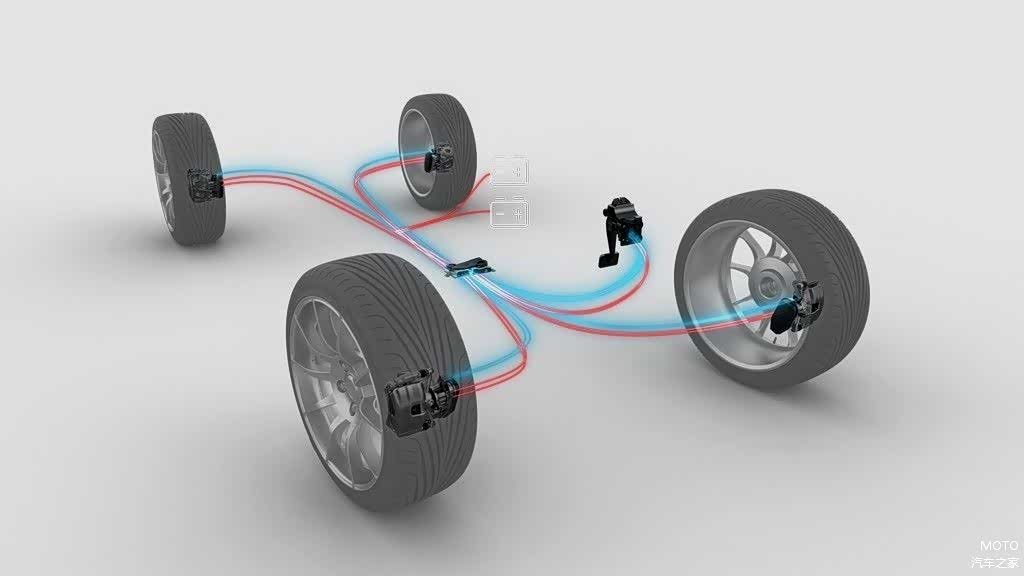 传统刹车靠液压分帮将踏板施力化为油压,推动卡钳夹住碟盘; 而电子制动系统则完全不同。 电子制动系统是当驾驶踩下刹车踏板后电子信号会测量力道,然后卡钳内的电动马达会直接施力夹紧刹车碟盘。 整套系统不再需要刹车油、不用总泵或油管,不靠油压产生制动力量,而是全由电子控制。