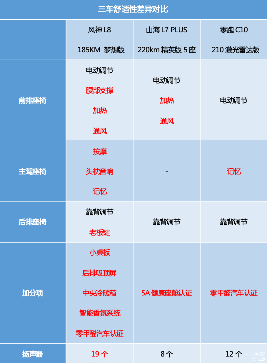 小结:称职的家用车就是要让全家都坐得舒适,要做到这一点并非易事。山海L7 PLUS座椅功能还算齐全,但座椅按摩、吸顶屏、小桌板、冷暖箱这些高端配置全部缺失;零跑C10受限于价格较低,就连前排座椅通风、加热都需要选装。而风神L8则为全家人带来超预期的舒适和满足感,自带的“豪车五件套”让舒适一步到位,冷暖箱满足全家饮品需求,吸顶屏让长途自驾不无聊,按摩大沙发缓解驾驶疲劳,小桌板能办公也能哄娃,19扬声器坐哪都是C位音效,方方面面都照顾到了,给它点个赞。