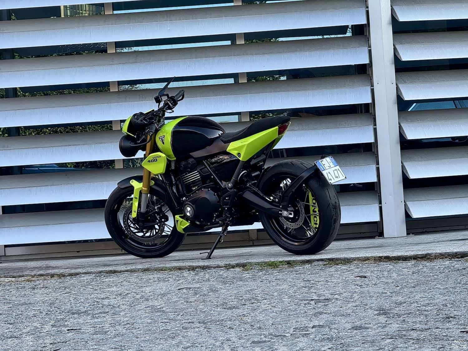 设计师特别参考了 Speed Triple 955i 和 1050 的元素,最明显的就是车头那组标志性的「双圆灯」设计俗称的青蛙眼,这可是当年 Speed Triple 定义 Streetfighter 风格的灵魂所在。 虽然这只是一辆 400cc 的单缸车,但通过这些经典元素的加持,它展现出来的气场一点也不输给当家的大排气量老大哥们。
