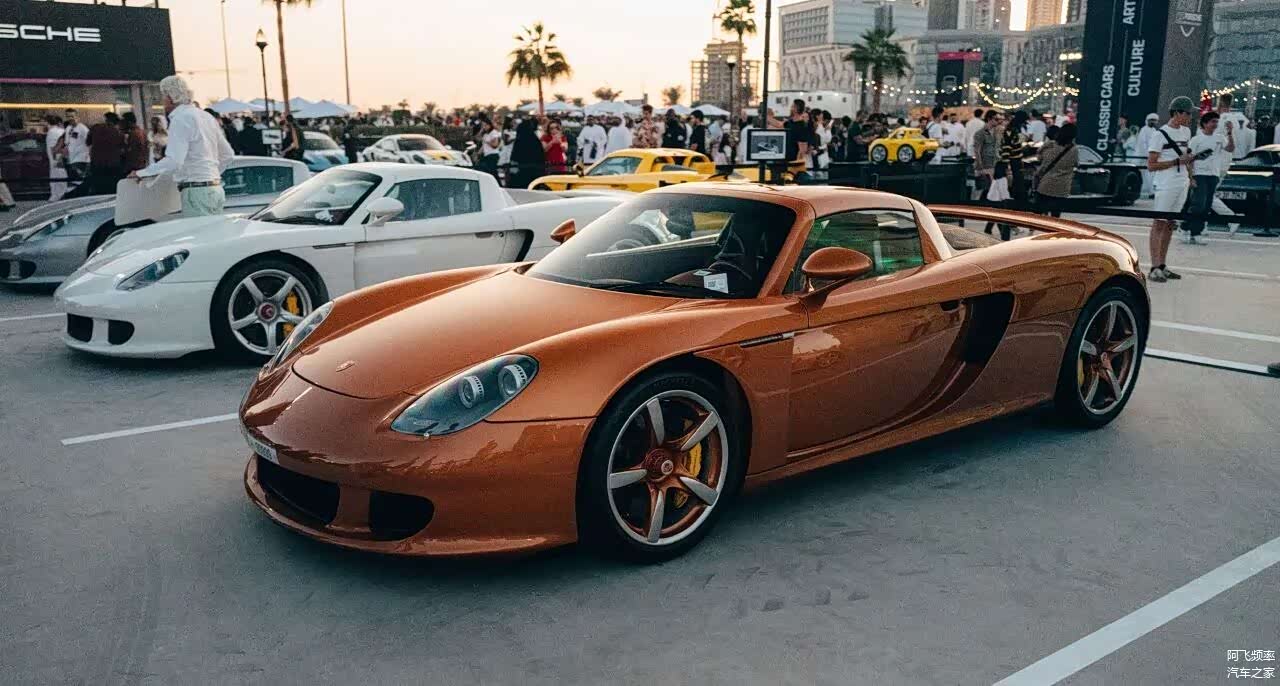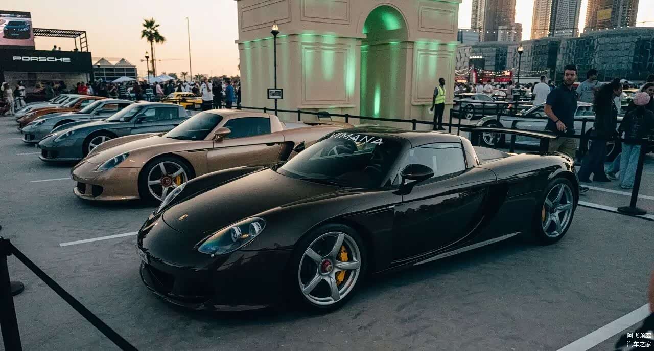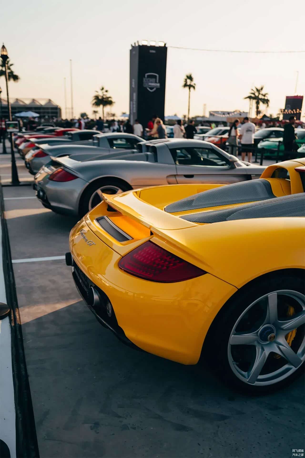 如今,这场致敬将雨幕换成了迪拜的烈日,16台Carrera GT一字排开,每一台都带着独特的色彩组合或同色轮毂,诉说着这台千禧年超跑的不朽魅力。