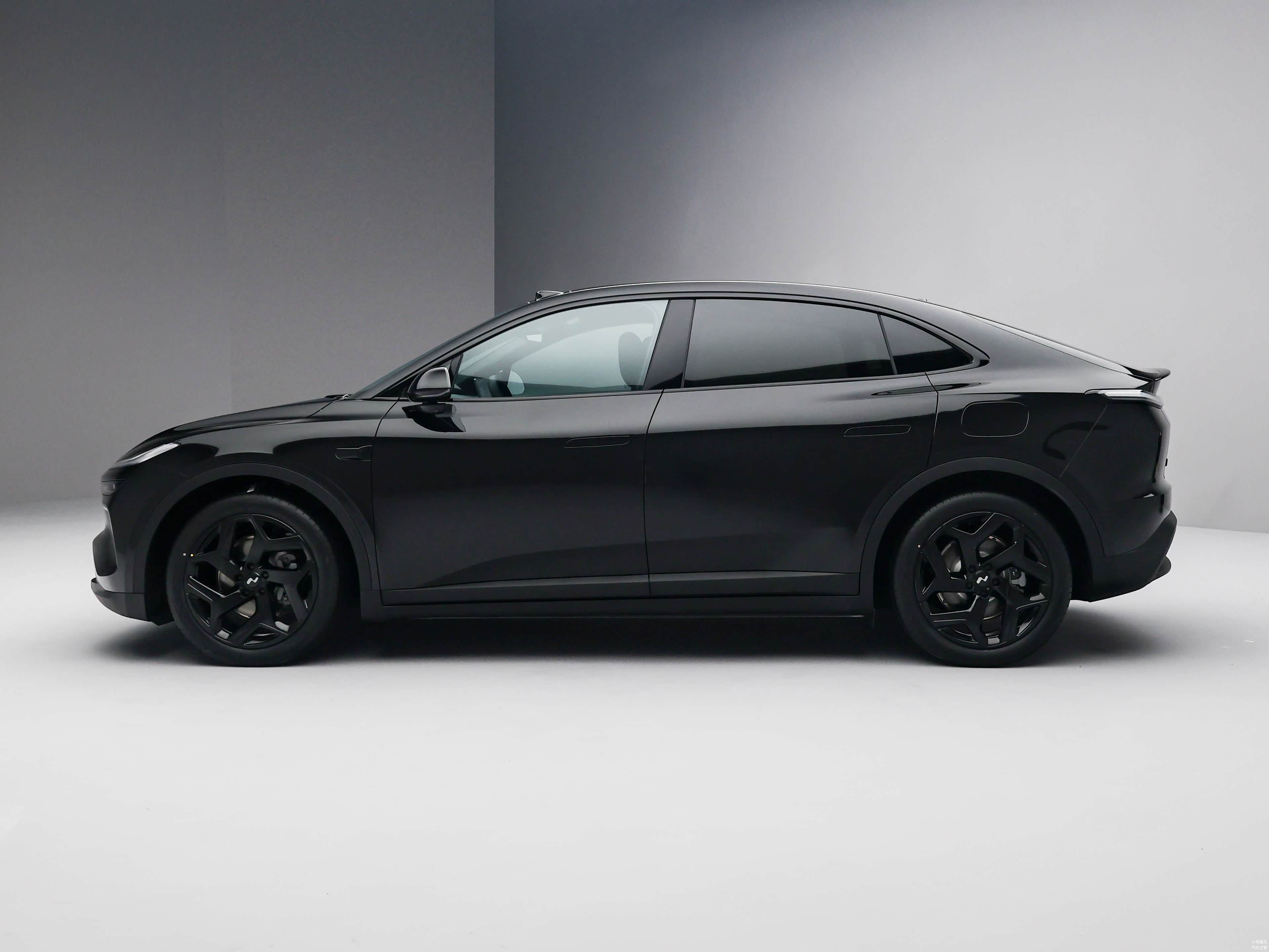侧面造型方面,车顶采用了溜背式造型,线条感显得比较干练,有着浓浓的轿跑SUV风格;腰线采用了分段式设计,点缀出了车身侧面的层次感;门把手则是弹出式设计,能够起到降低风阻的作用;轮眉和侧裙部分设计有隆起的黑色饰板,凸显了力量感;轮毂则是熏黑的五辐式造型,质感营造的非常到位。