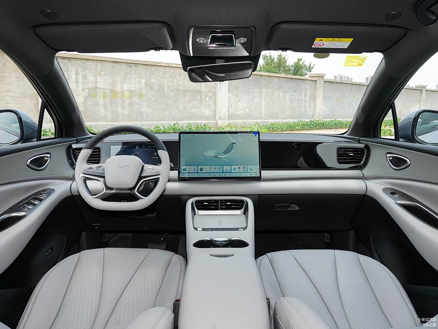 进入车内,海洋美学设计语言延伸至座舱内部,整体风格简约大气又不失精致。10.25 英寸全液晶仪表搭配 15.6 英寸悬浮式中控屏,组成科技感十足的双屏组合,中控屏支持旋转功能,配合比亚迪 DiLink 5.0 智能网联系统,操作流畅度媲美高端平板电脑。全系标配的 “你好小迪” 语音助手,支持免唤醒、多区域识别与连续对话,调空调、导航、开天窗等操作均可语音完成,大幅提升驾驶安全性。2820mm 的超长轴距带来宽裕的腿部空间,身高 185cm 的乘客坐进后排,腿部仍有两拳余量,头部空间也毫不局促。