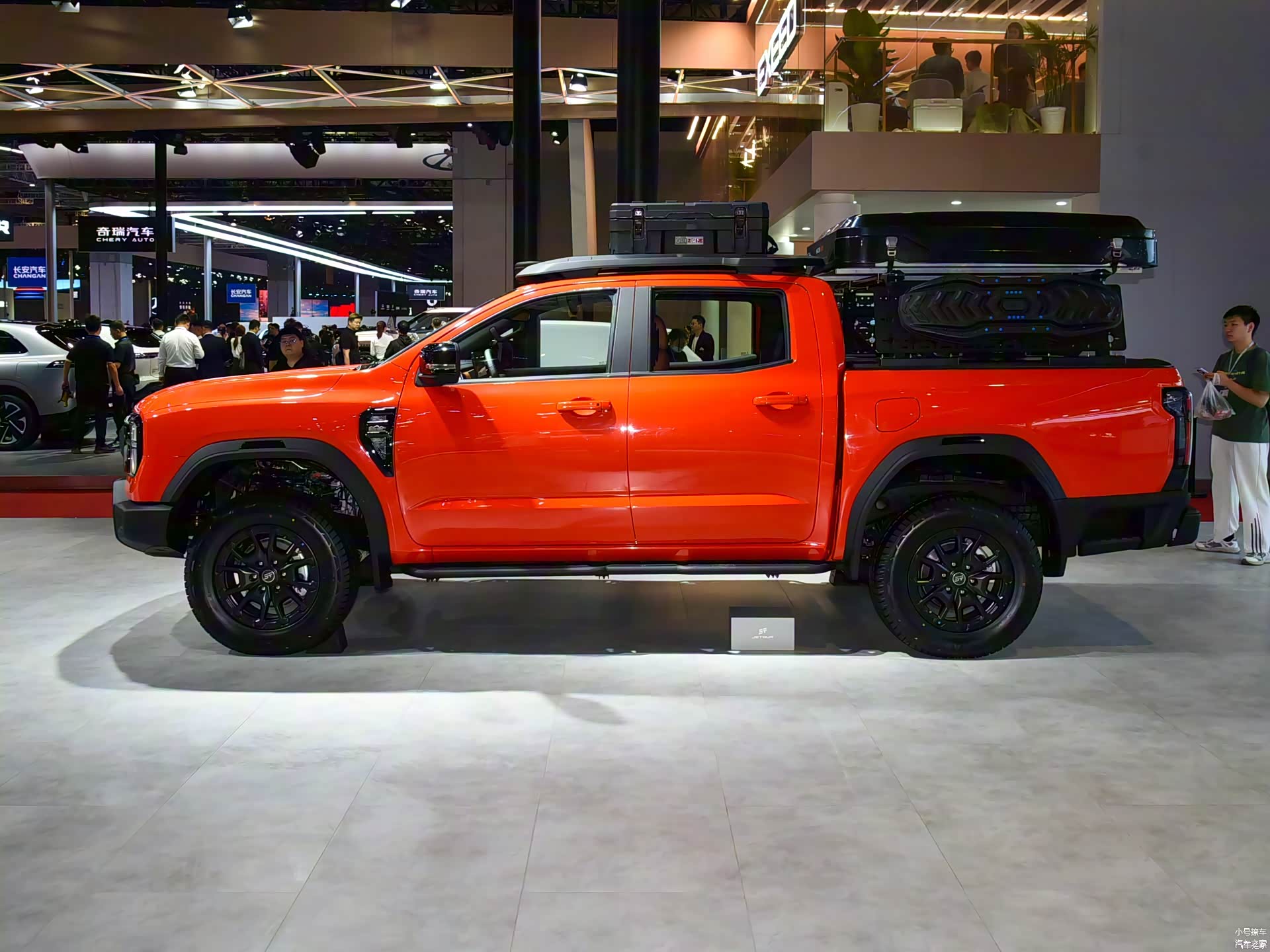 侧面造型方面,车身采用了双排皮卡造型,车顶线条比较平直,贯穿式的腰线造型也比较圆润,整体有着比较强的力量感;轮眉部分设计有隆起的黑色饰板,搭配侧踏板带来了比较狂野的视觉效果,轮毂则是多幅式熏黑造型,整个车身颇为魁梧。