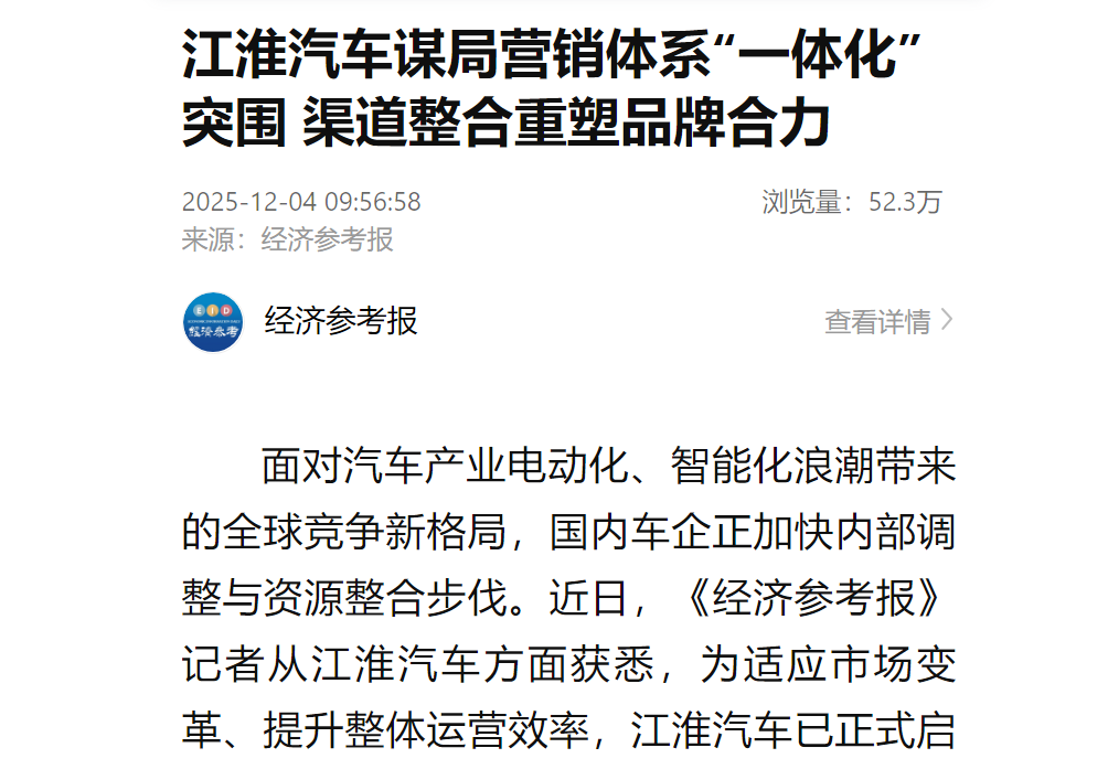 组织对齐是整合的核心前提。江淮彻底改变过去三大板块分散决策的模式,建立统一的营销体系指挥中枢,实现从市场调研、用户反馈到产品规划的“一站式”决策。这种调整大幅缩短了响应链路。