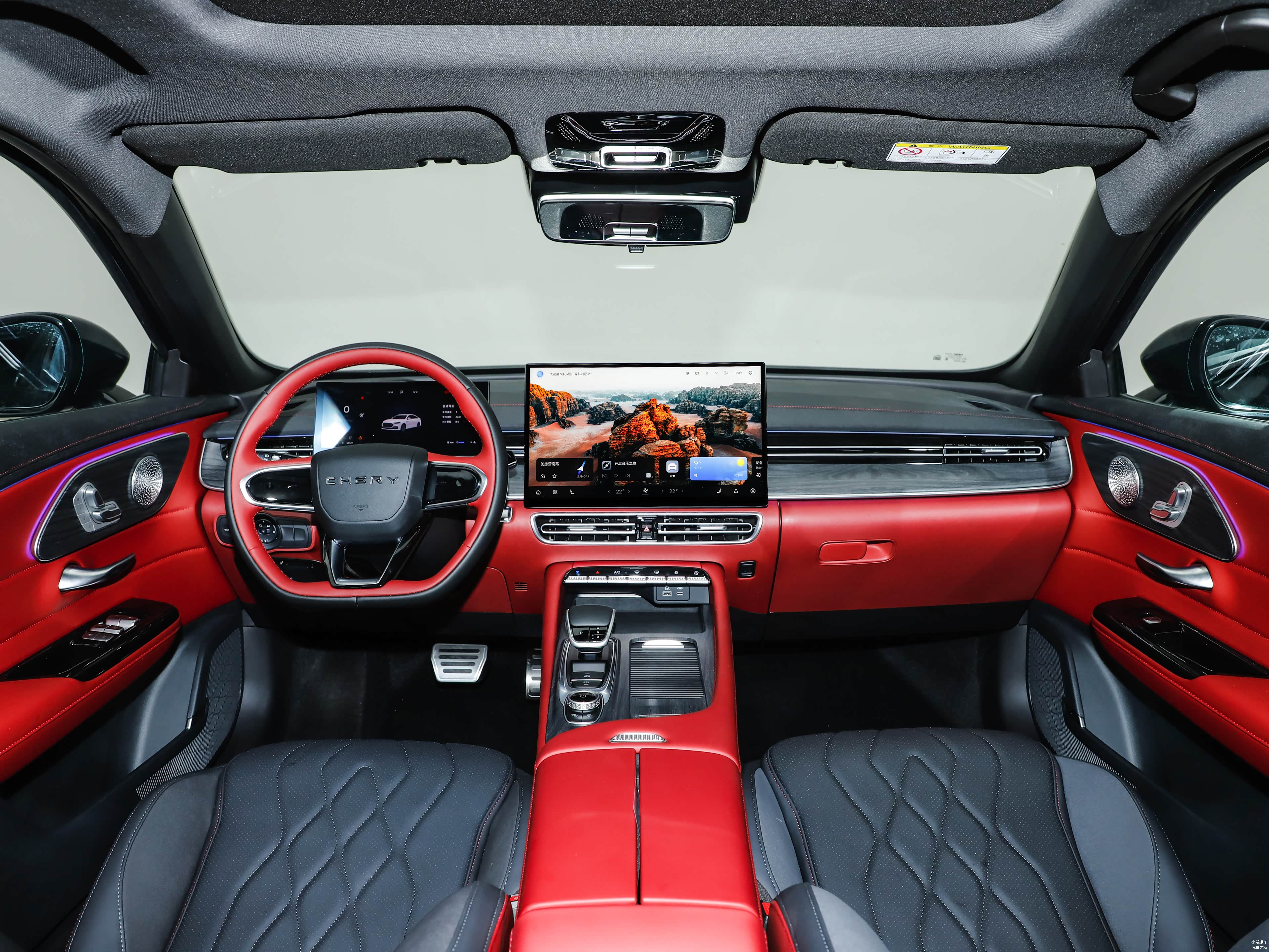 内饰方面,整体布局也是比较简洁的类型,提供有三幅式平底多功能方向盘、悬浮式全液晶仪表盘、悬浮式中控屏以及电子档把,中控台的层次感也比较出色,而且加入了木纹风格饰板进行装饰。