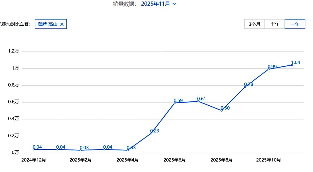 根据公开的销量显示,2025年4月销量只有300台左右的魏牌高山,6月销量就上升到了5949台,9月销量升至7768台,10月销量升至9928台,11月销量更是达到了10416台,这也是魏牌高山自上市以来首次实现月销过万,不仅晋级月销过万俱乐部,还成为扮演了细分市场搅局者的角色。