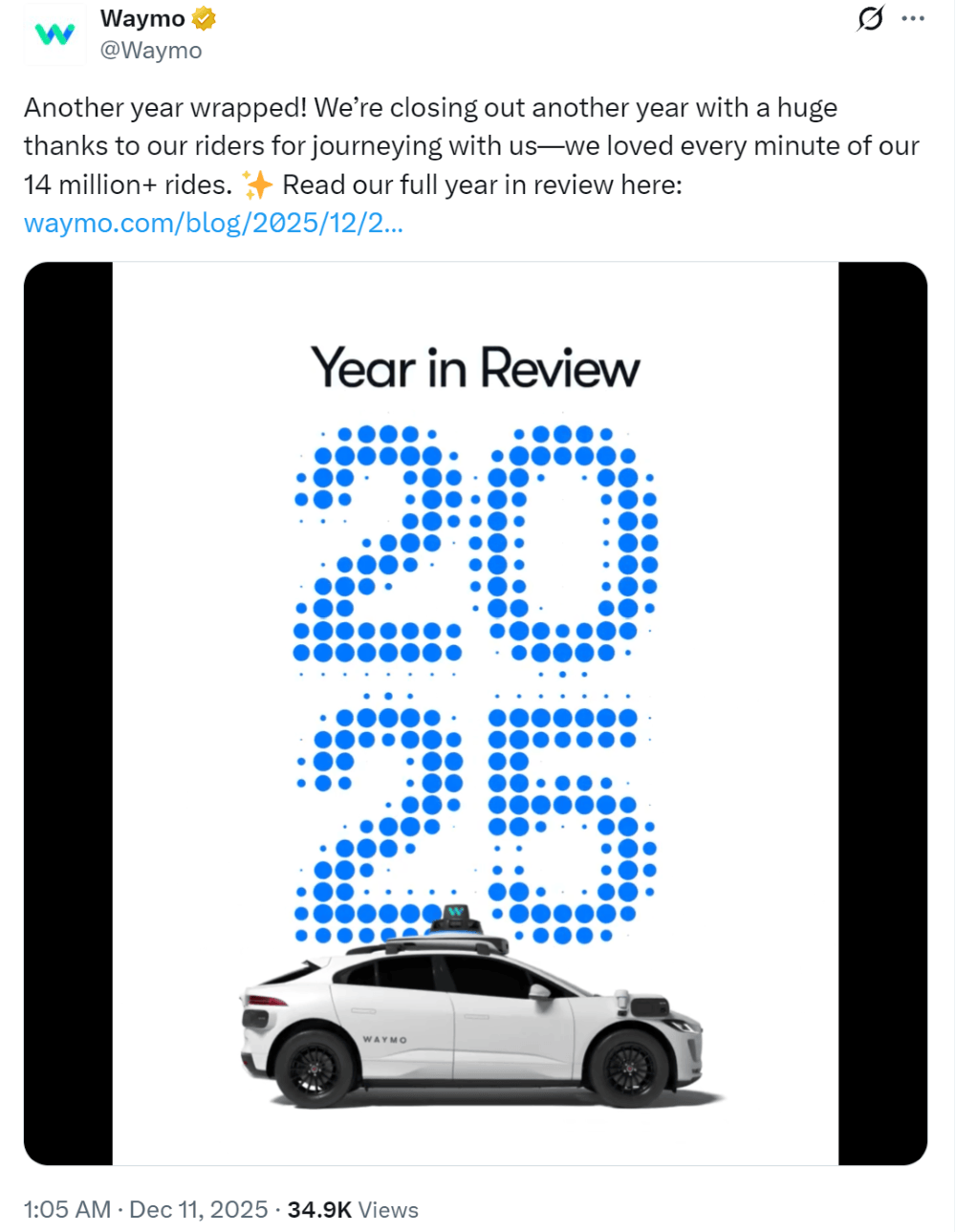 总体而言,2025年一整年,Waymo提供了超过1400万次Robotaxi服务,比去年增长了3倍以上,并有望在年底突破累计2000万次大关。