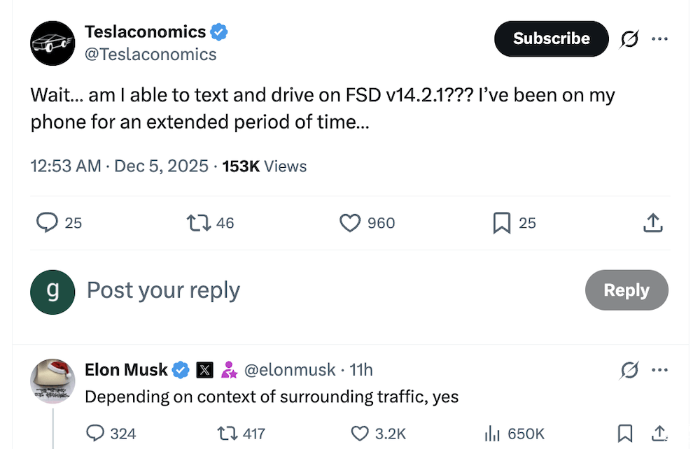 就在一周前,马斯克还确认,特斯拉FSD系统带来一项重大升级,允许用户在自动驾驶状态下发送短信,该功能已随FSD v14.2.1版本推送。