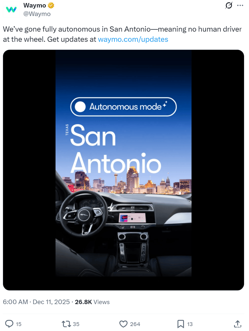 ▲Waymo官宣在圣安东尼奥实现车上无安全员的Robotaxi服务
