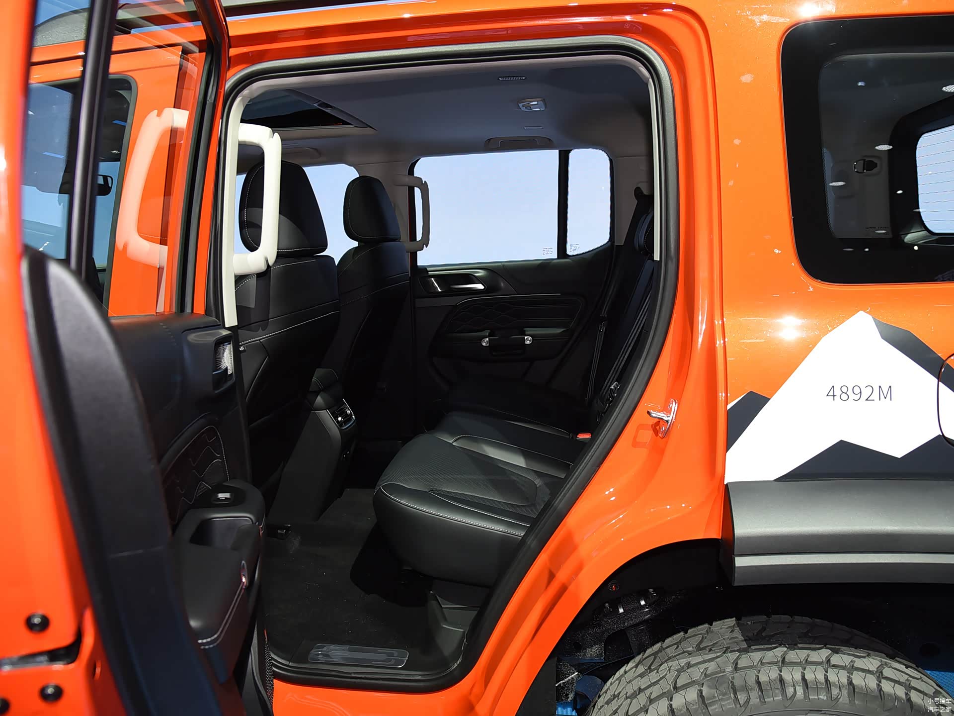 侧面造型方面,车顶线条比较平直,配备有粗壮的行李架,车身风格也比较方正,有着浓浓的硬派气息;腰线采用了贯穿式设计,点缀出了车身侧面的层次感;轮眉和侧裙部分设计有粗壮的黑色饰板以及踏板,搭配多幅式熏黑轮毂以及AT全地形轮胎让视觉效果更显魁梧。