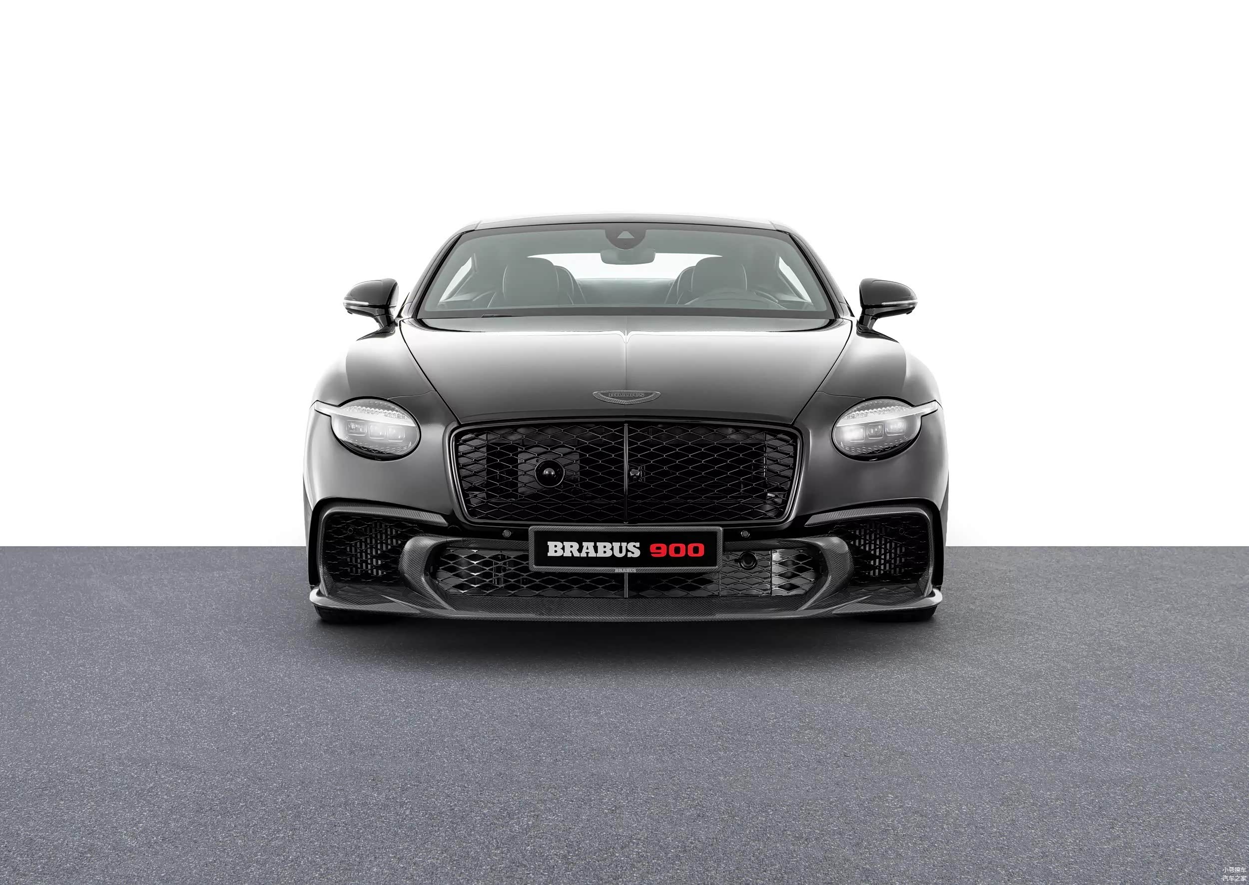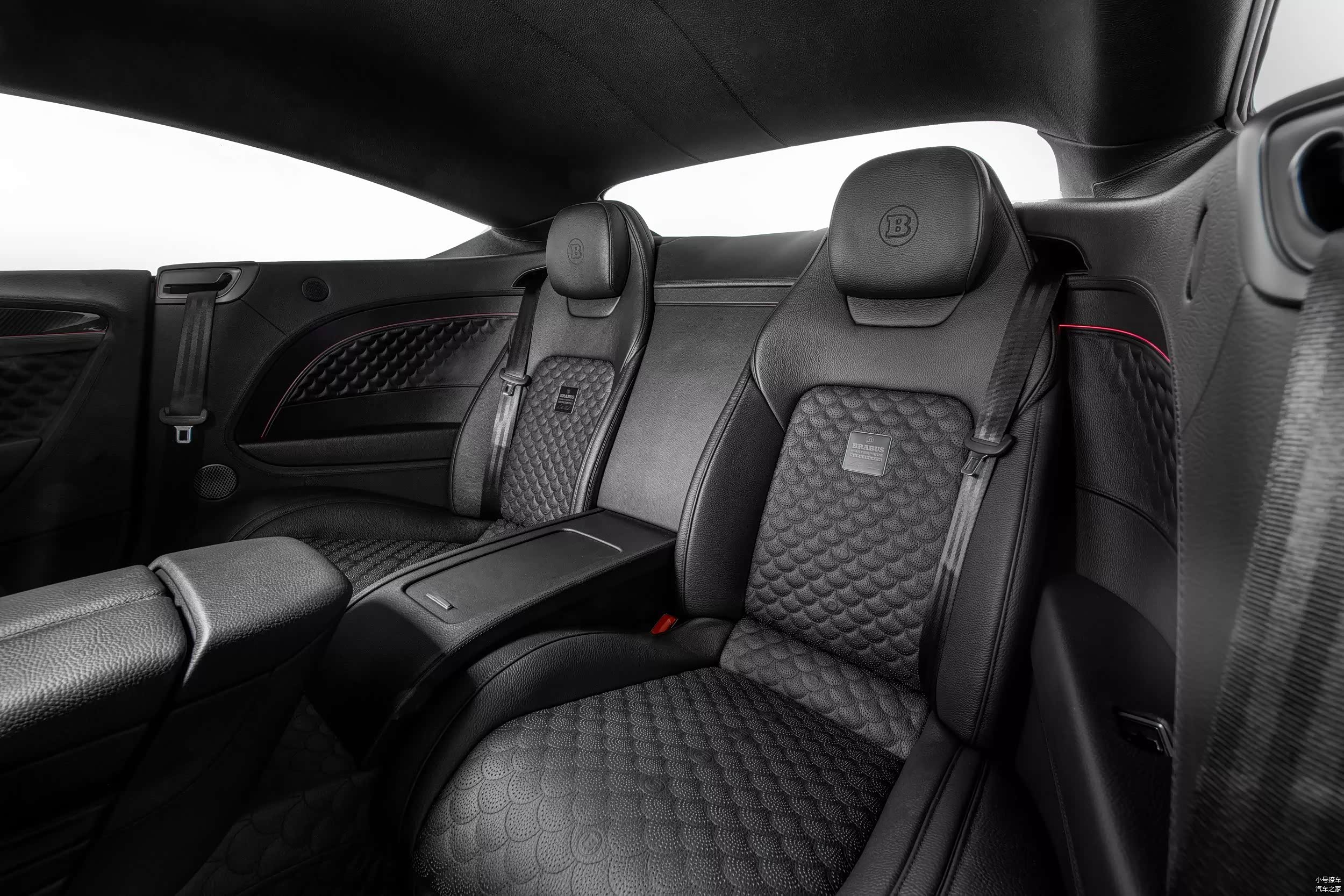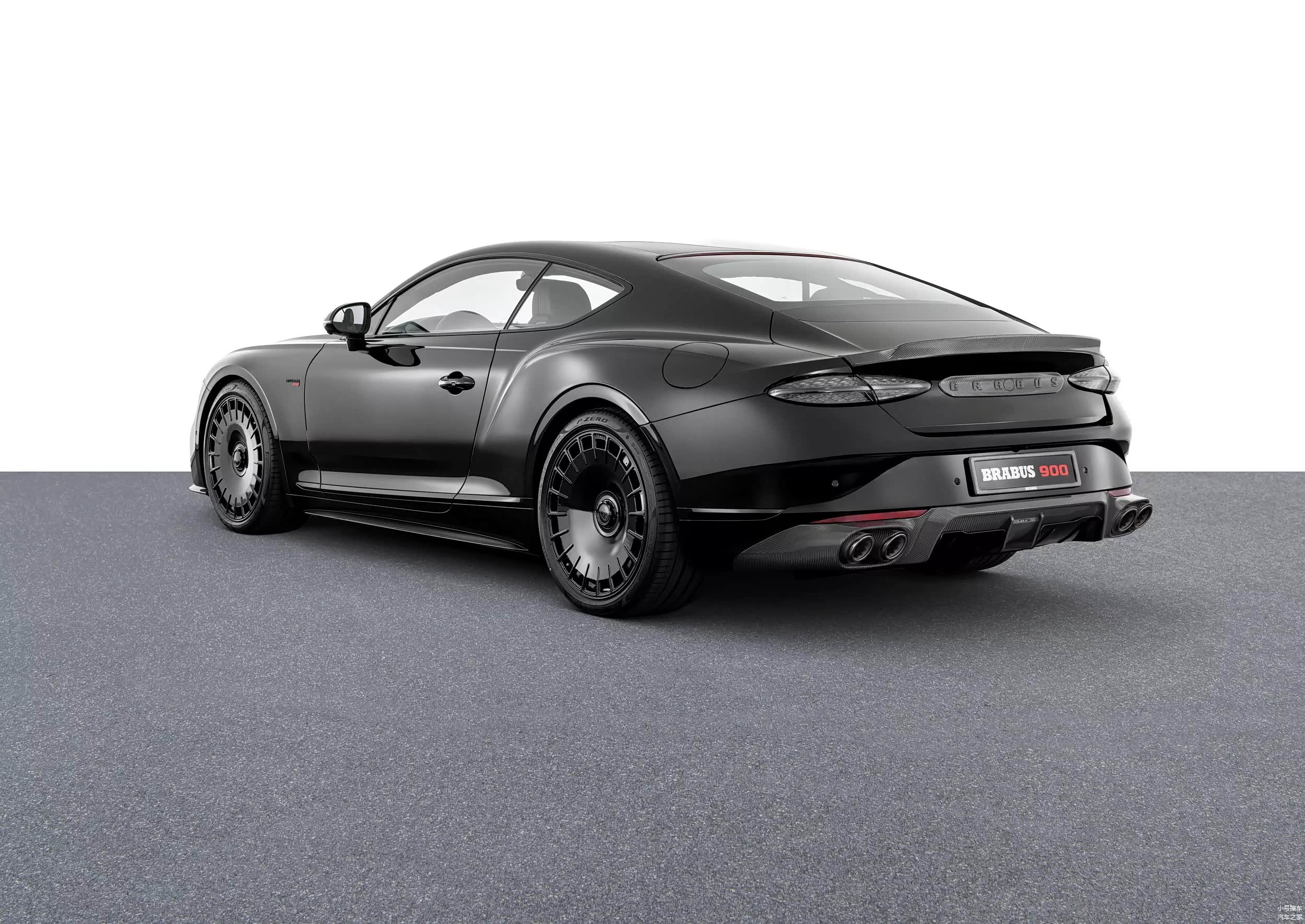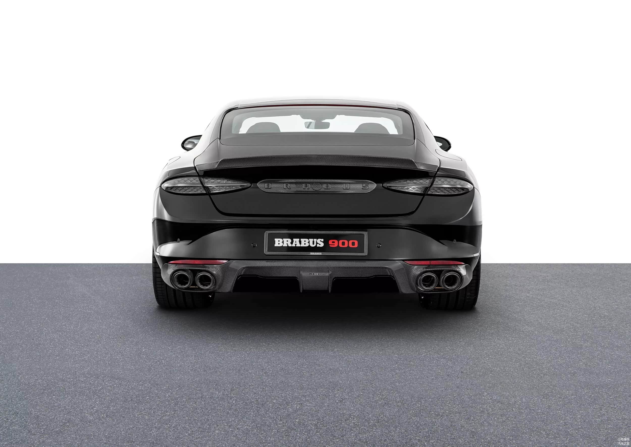 尾部造型方面,后备箱顶部设计有碳纤维结构的扰流板,熏黑的尾灯组采用了椭圆形设计,内部点阵式光源和原车保持一致,不过宾利相关的标志都被取消了,取而代之的是Brabus标志,下包围部分配备有造型夸张的扩散器,排气管则是双边共四出布局。