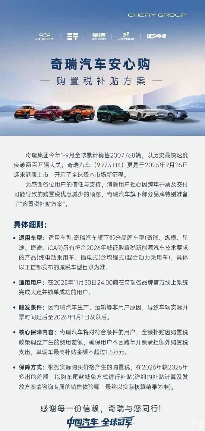 行业普遍预期2026年一季度国内车市将承压,主机厂此举属于未雨绸缪。根据厂家公布的方案来看,除明年购置税从全免调整为减半征收外,很多车企将这一波‘兜底’政策截止日期定在2026年2月14日,也是在将部分订单释放至明年一季度,以求届时完成平稳过渡。