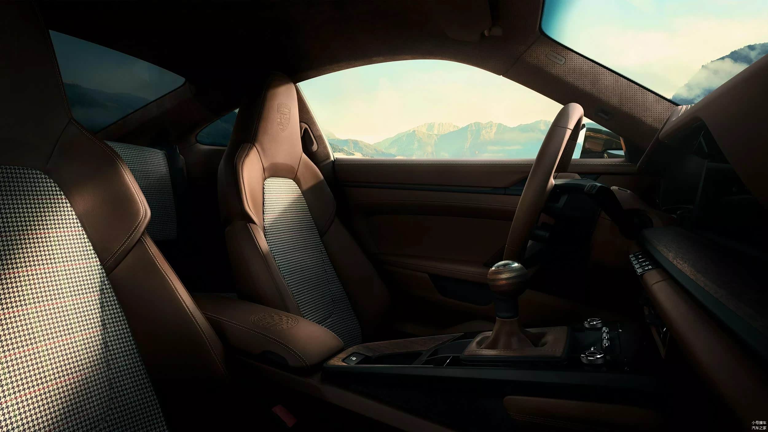 内饰方面,整体布局也没有变化,提供有三幅式平底多功能方向盘、全液晶仪表盘、内嵌式中控屏以及球头挡把,内饰内饰采用网格编织,座椅采用松露棕皮革与织物混搭材质,质感比较出色。而且车辆仪表台镶嵌的金色铭牌刻有初代911轮廓剪影、F.A.保时捷的亲笔签名以及限量90台的字样,彰显了独特的身份,而且随车附赠Porsche Design限量特别版Chronograph I腕表和旅行包。