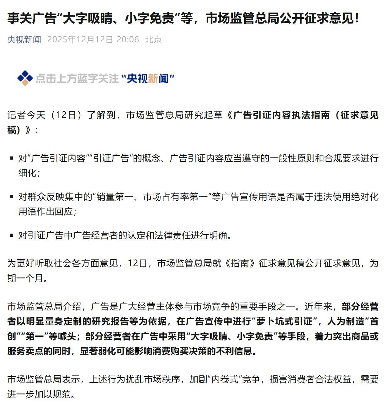 市场监管总局明确指出,近年来不少广告通过明显量身定制的研究报告,制造“首创”“第一”等概念,或者用“大字吸睛、小字免责”的方式弱化关键信息,误导消费者的购买决策。这类行为不仅损害消费者权益,也扰乱市场秩序,加剧恶性竞争。