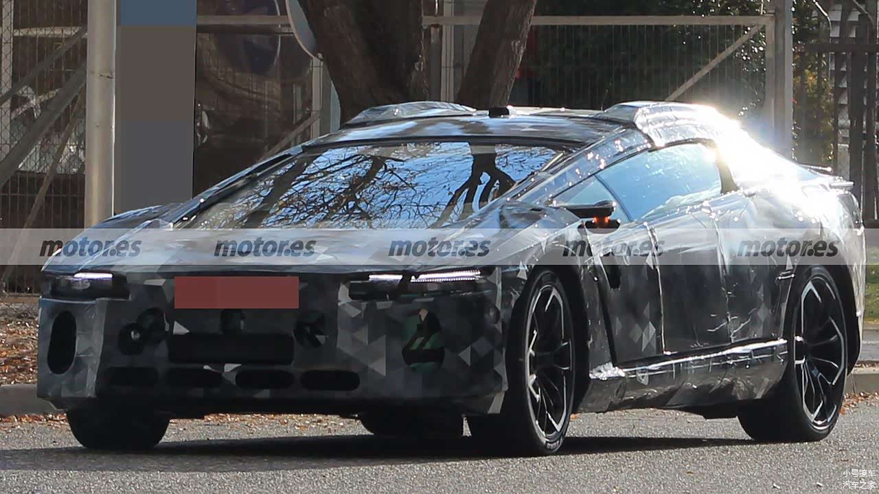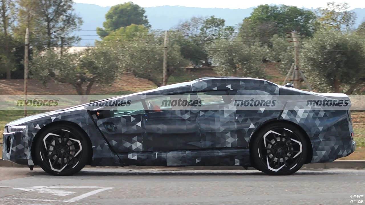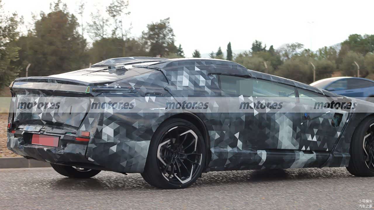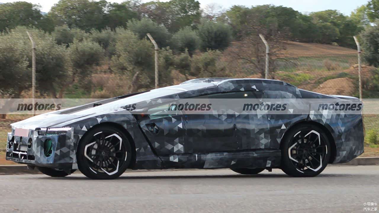 车身侧面来看,新车的车身比例和传统超跑有明显不同,前挡风玻璃和前舱盖几乎是一条直线,对于风阻会比较友好,而且A柱部分侧窗的尺寸非常大,这会让驾驶员的侧向视野非常开阔;前翼子板位置可能会有导流槽,侧裙部分还会有空气动力学套件,轮毂采用了多幅式双色造型,搭配有大尺寸刹车盘,轮胎则是倍耐力P Zero系列。