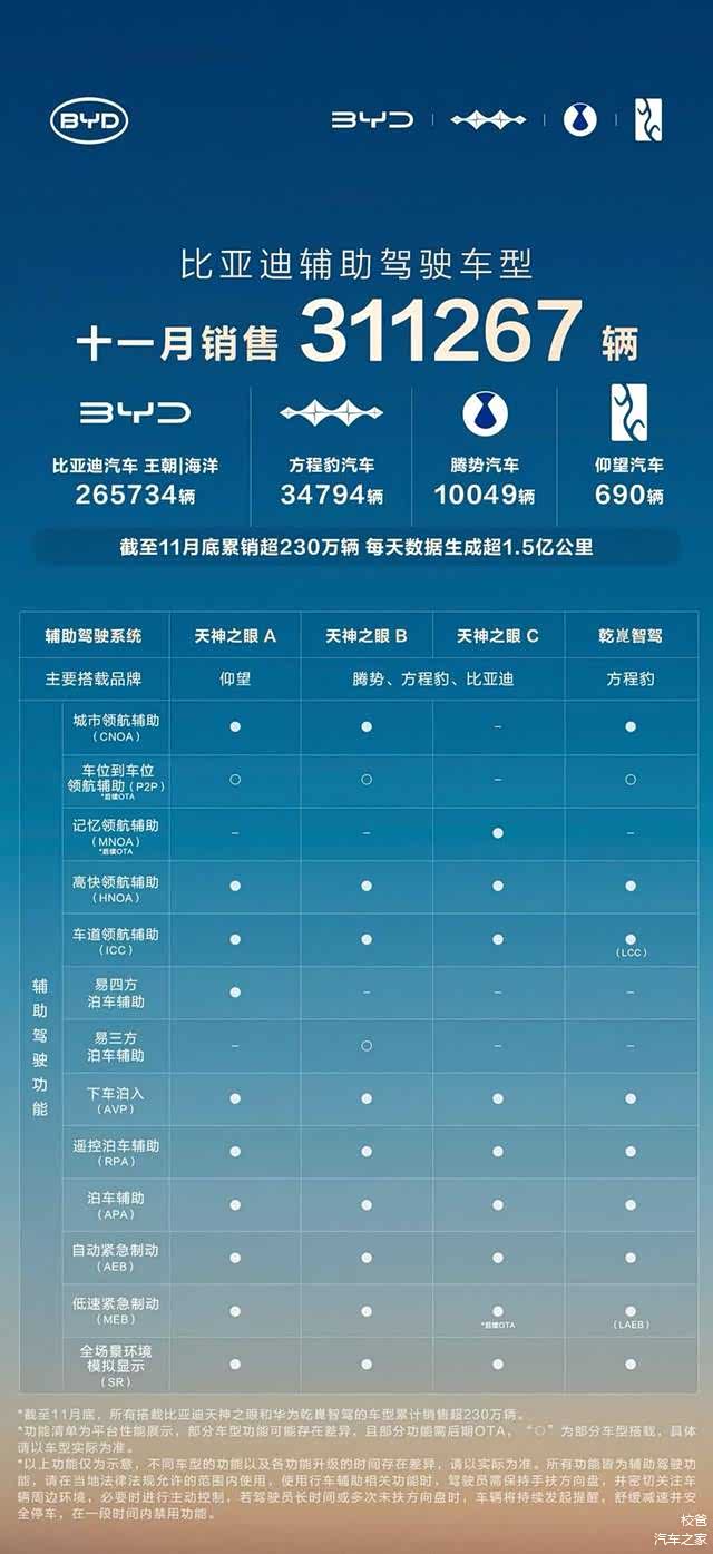 最近,比亚迪公布了搭载天神之眼辅助驾驶系统的车型11月的销售数据,整个月一共卖了311267辆,还在继续加速普及辅助驾驶,一直领着市场走。