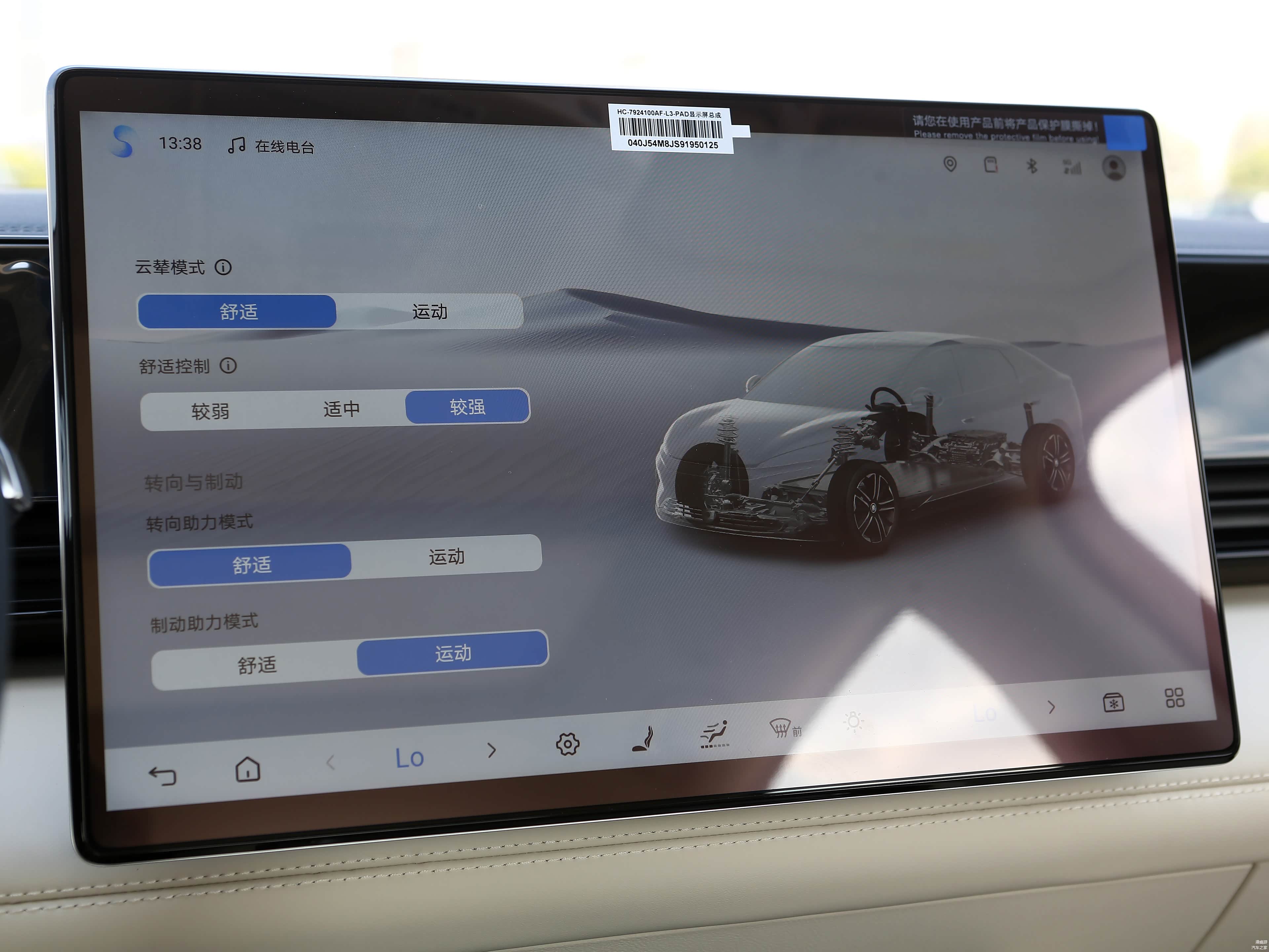 动力与悬架系统是云辇款的核心竞争力之一。车辆基于e平台3.0Evo打造,搭载高度集成的八合一后驱动力总成,电机峰值功率达160kW,效率更高且故障率更低,起步响应迅速,刹车时能有效抑制点头。后置后驱布局在同级中并不常见,前后配重均衡,弯中急加速时可有效避免扭矩转向,同时能减少纯电车常见的晕车,带来更稳定舒适的驾乘体验,5.4m的最小转弯半径让窄路调头更加灵活。
