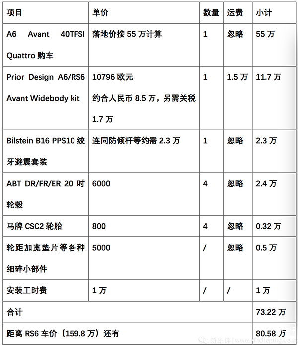 到这一步,外观基本上就已经搞定了,而且所有部件全部采用国际一线品牌出品,完全杜绝“汽配城”味儿,即便在真RS6前,也绝对抬得起头。要不先让我们看看这么一个牛叉的外观升级方案,连同购车价在内,总共要花多少钱: