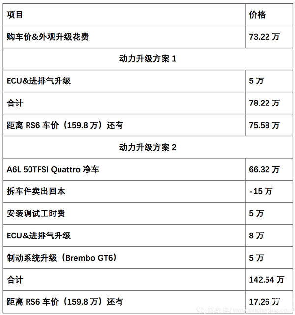 忽略省事的方案1,可见即便是夸张到了方案2这个程度,花费也依然距离RS6有十多万,而且是未含税未选装的净车价,性能方面却已经追平奥迪S6了,更不用提外观的凶悍程度甚至连原厂RS6都不能比,可见这件事是有性价比的,即便看起来已经更像是胡闹了。