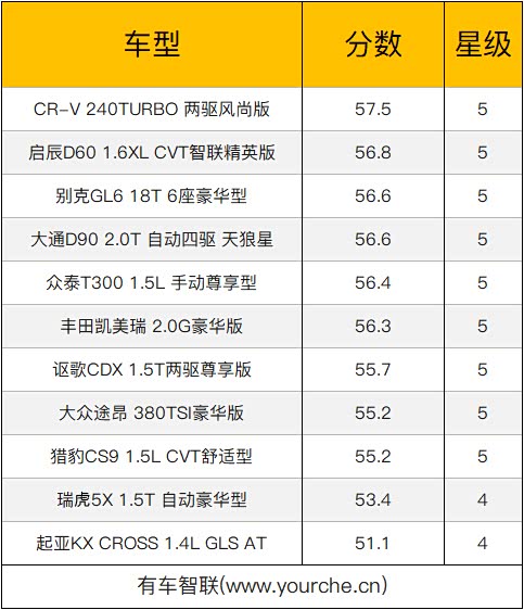 1、试验车型:东风本田汽车有限公司 思威牌/CR-V DHW6463R1CSE型多用途乘用车(CR-V 240TURBO 两驱风尚版);碰撞成绩:57.5;评级:★★★★★。