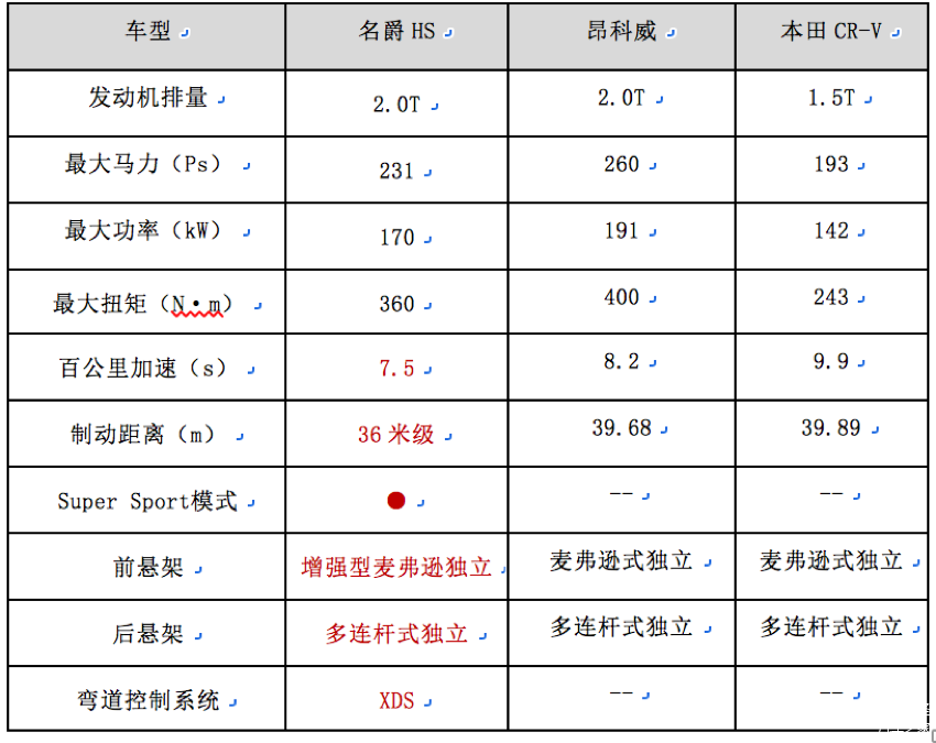 作为世界500强第36名、中国汽车企业毫无疑问的NO.1,上汽集团的实力毋容置疑,而且这么多年在研发上始终坚持高投入,拥有了“蓝芯”、“绿芯”等世界领先的动力水平。依托上汽集团的强力背书,名爵HS的动力表现“爵对”给力。名爵HS搭载上汽全新调校的“蓝芯”30T Trophy高性能版缸内中置直喷涡轮增压发动机,最大马力231Ps,最大扭矩360N·m,全面压制本田CR-V的动力表现。而且名爵HS的百公里加速仅7.5秒,全面领先于昂科威8.2S和本田CR-V 9.9S的百公里加速成绩。相比于名爵HS的动力咆哮在线,昂科威由于车身较重,起步有点延迟,但是提速快,换挡清爽;本田CR-V的动力表现则偏弱,超车提速的反应慢,而且急加速是弱项。所以对运动感有追求的年轻人,就只能把本田CR-V排除在外了。