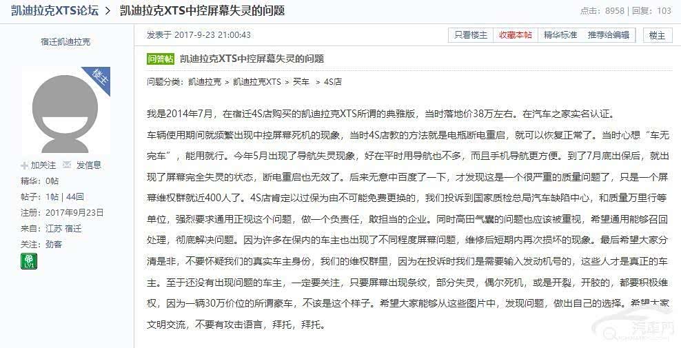 此前,汽车门网已经多次就凯迪拉克XTS和SRX两款车型大面积存在的中控屏质量缺陷问题进行过跟踪报道,截止今日上汽通用凯迪拉克厂商也未就此事进行过任何回应和答复,目前事件仍处于持续发酵当中。