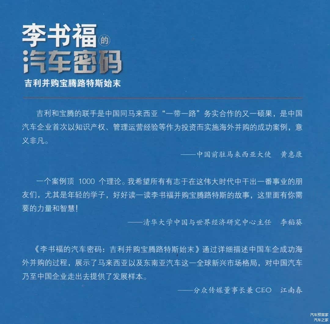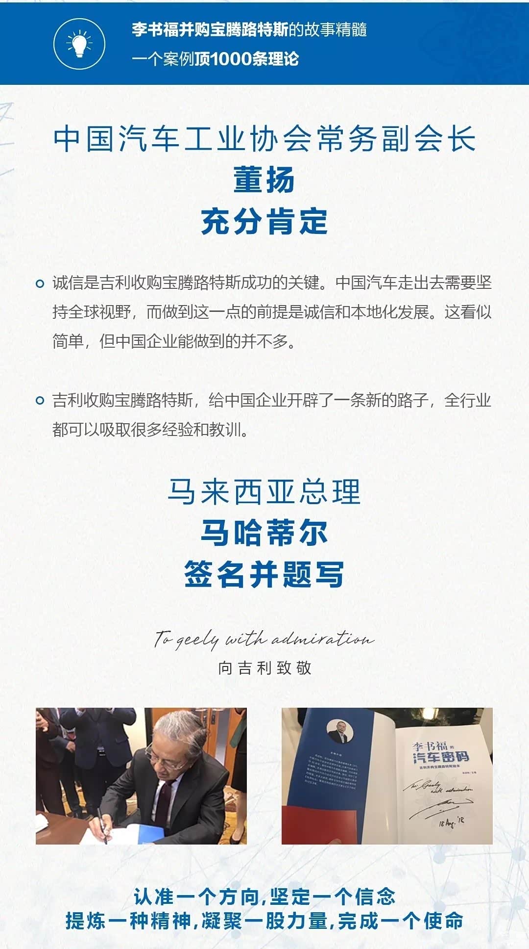 一个案例顶1000个理论。我希望所有有志于在这伟大时代中干出一番事业的朋友们,尤其是年轻的学子,好好读读李书福并购宝腾路特斯的故事,这里面有你需要的力量和智慧!
