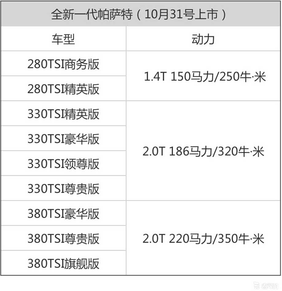 新款车型提供1.4T和2.0T高低功三种动力总成,与全新一代帕萨特动力也一致。