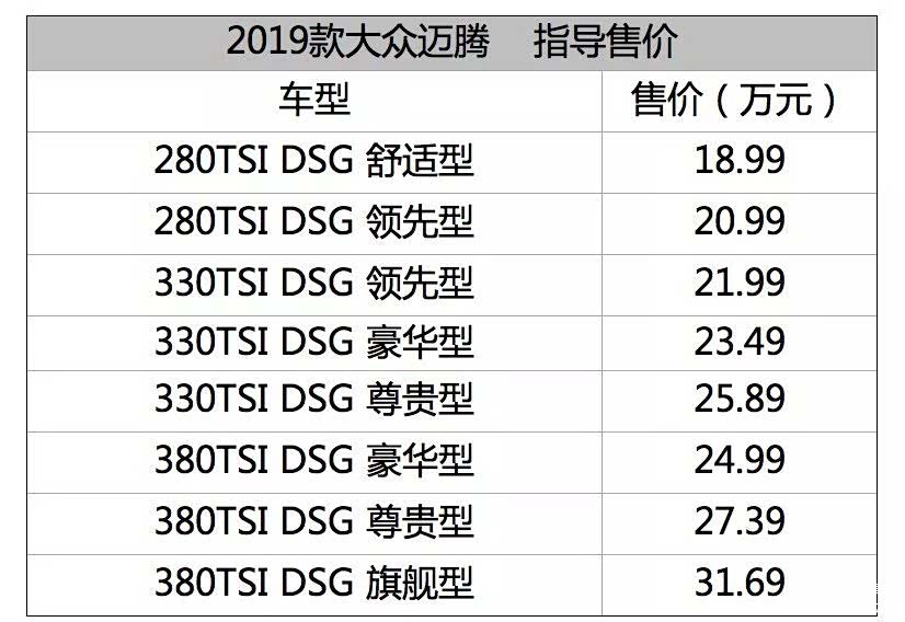 新款迈腾的售价区间为18.99万-31.69万元,售价较现款并没有上涨,同时,新款330TSI车型采用了EA888 2.0T低功版发动机,放弃了现款的1.8T发动机。