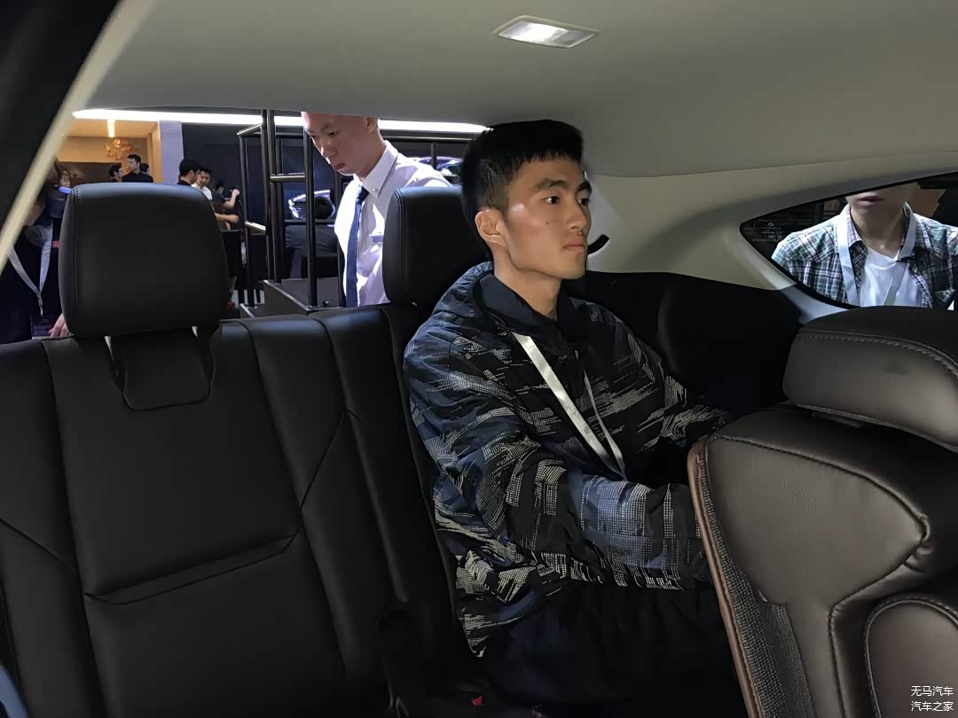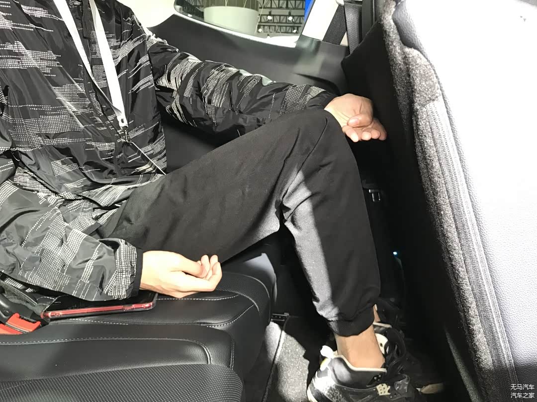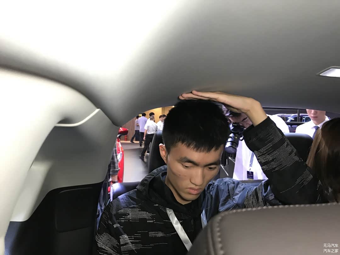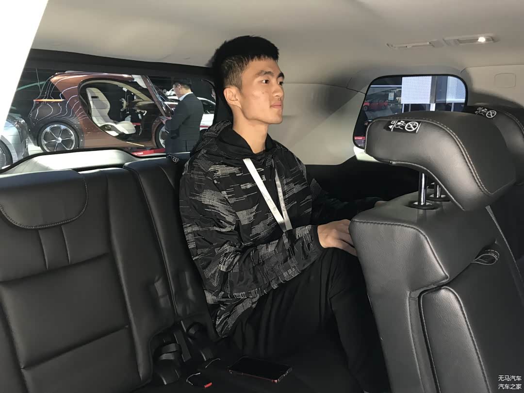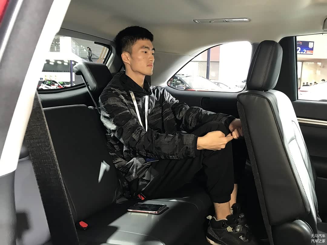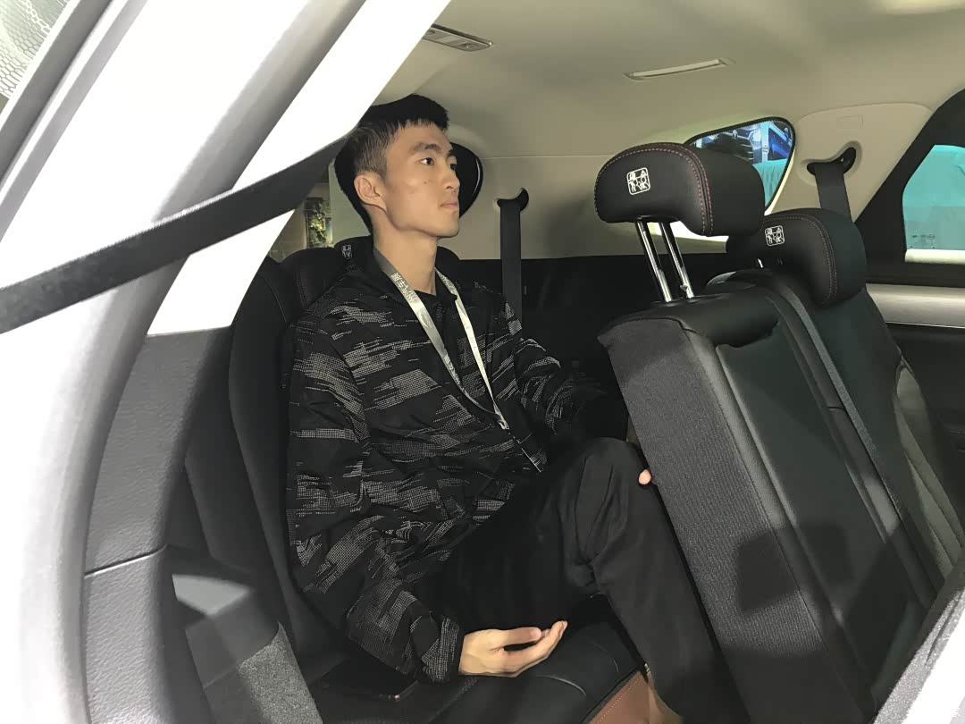 其实上去之前我们就有所预测欧蓝德的表现不会特别地好,可以看到的是,我们的测试者坐上去之后,无论是腿部空间还是头部空间,都是顶着的,没有一丁点的富余,是所有车型中最像是临时座位的感觉。