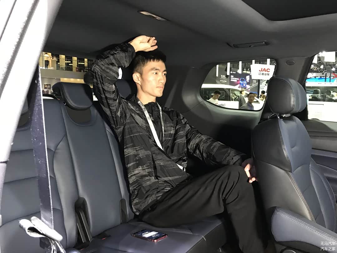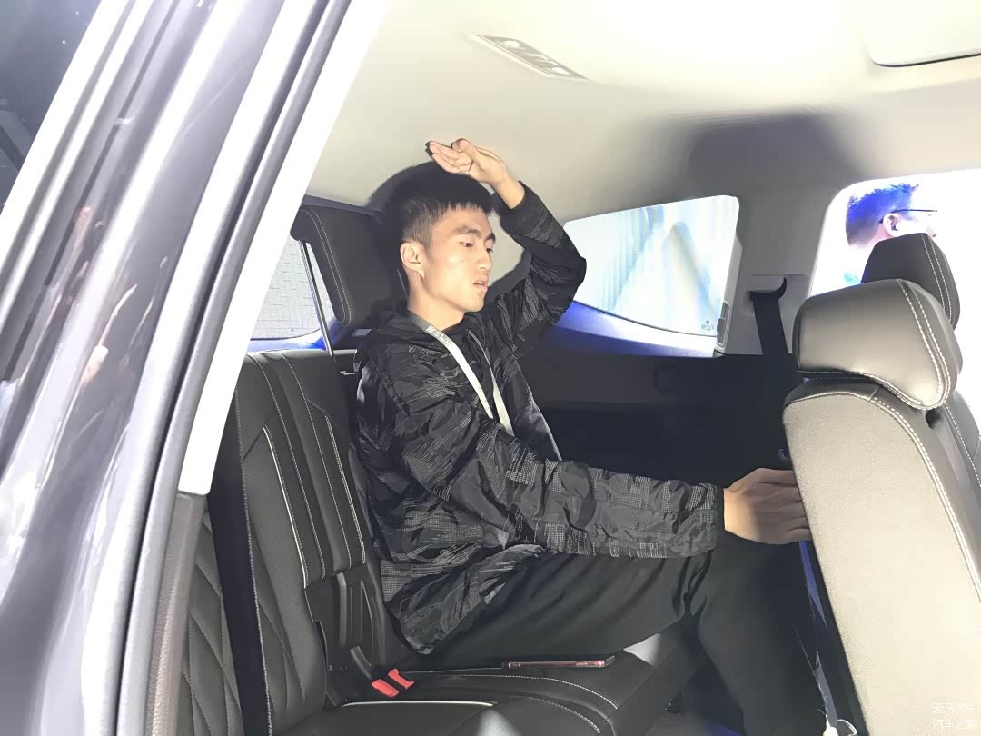 你别看发现5的车身尺寸看起来那么大,其实它的第三排空间表现还是比较差强人意的。我们可以看到测试者的腿部空间几乎是顶着第二排的座椅的,有一指左右的距离;然而高车身所带来的好处还是有的,这体现在了头部空间,可以说是同场最大的头部空间,有着一拳富余的惊喜表现。