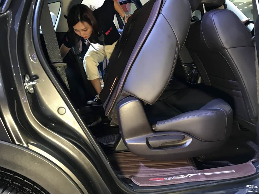 我们一直以为CX-8的空间表现会很“马自达”,但是这次它却给到了我们一定的惊喜。我们可以看到的是测试者坐好之后,它的腿部空间还有一拳三指左右的距离,这已经比在场的很多7座SUV都要好了;但是再来看的话,它依旧是一辆马自达,头部的剩余空间几乎是没有,蹭到了测试者的头发。