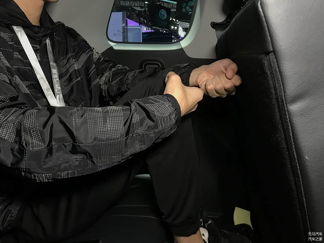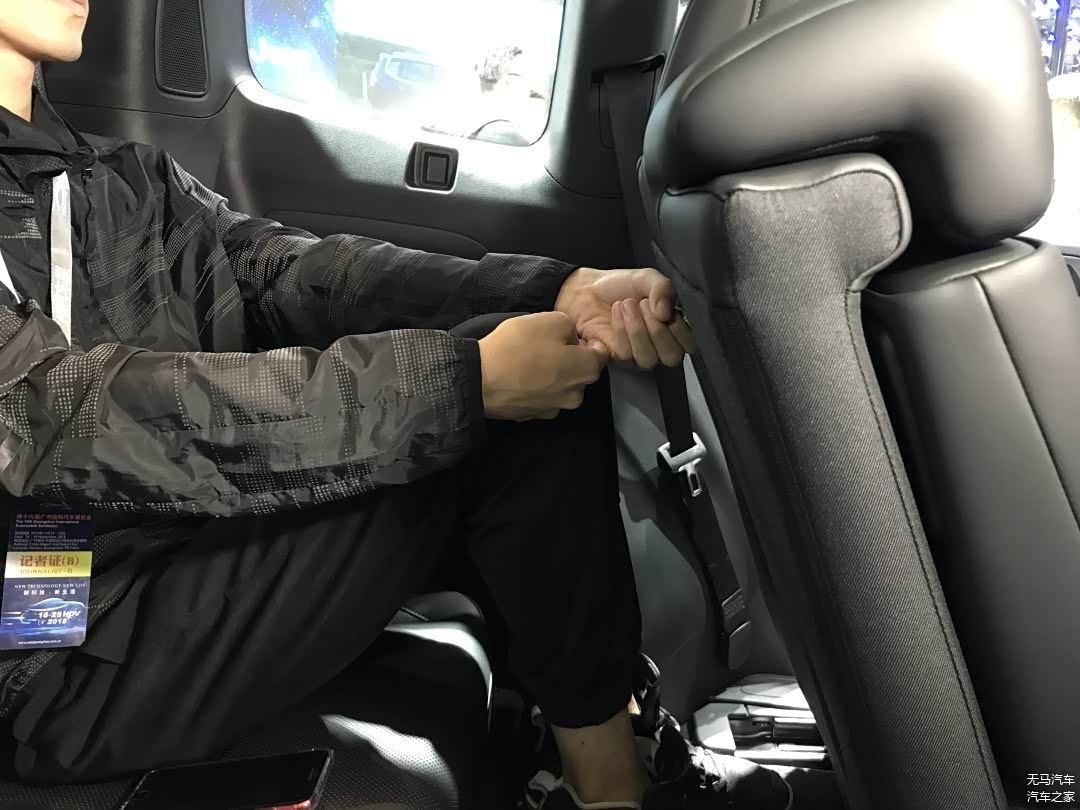 我们本以为以汉兰达为蓝本的GS8第三排空间表现会与汉兰达差不多,没想到的是它的表现居然比汉兰达还好。可以看到测试者坐下之后腿部空间剩余一拳四指左右的距离;而头部空间测试者表示其坐直之后也比汉兰达要富裕,为三指多的距离。