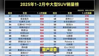 1-2月中大型SUV销量排名:问界M7失冠,蓝山排第9,揽月位列第32