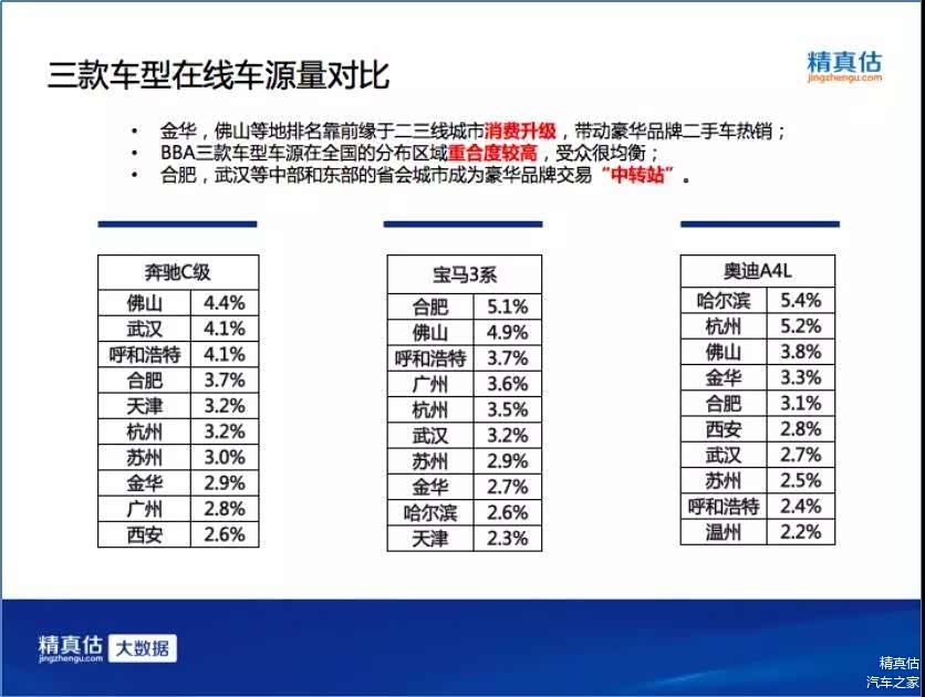 精真估大数据中心基于2018年度二手车线上数据,分析了奔驰C级、宝马3系、奥迪A4L三款车型的车源量、地区分布、保值率、车龄、里程等,通过数据洞察背后的更多信息。