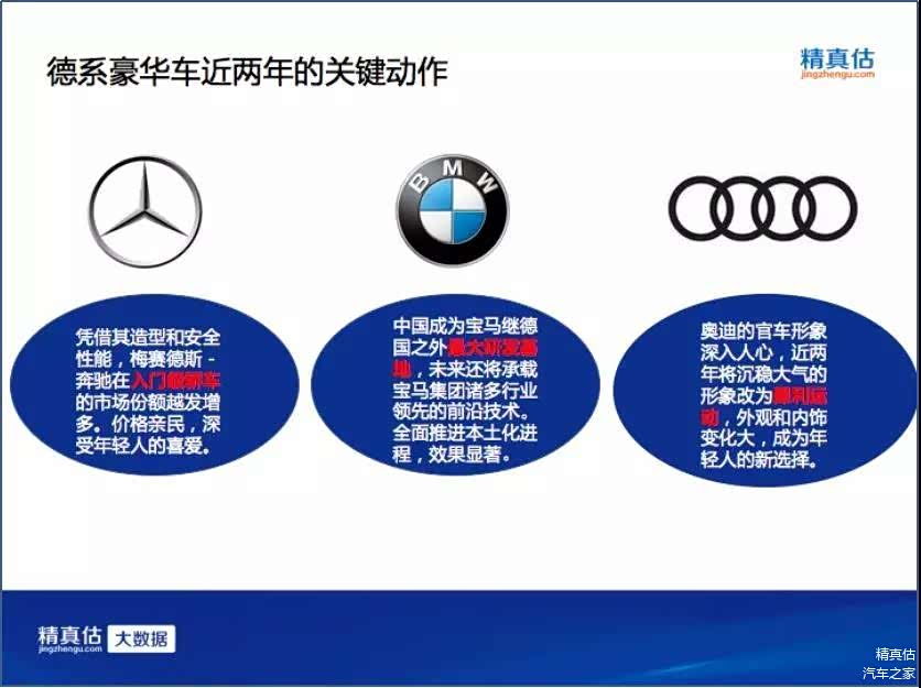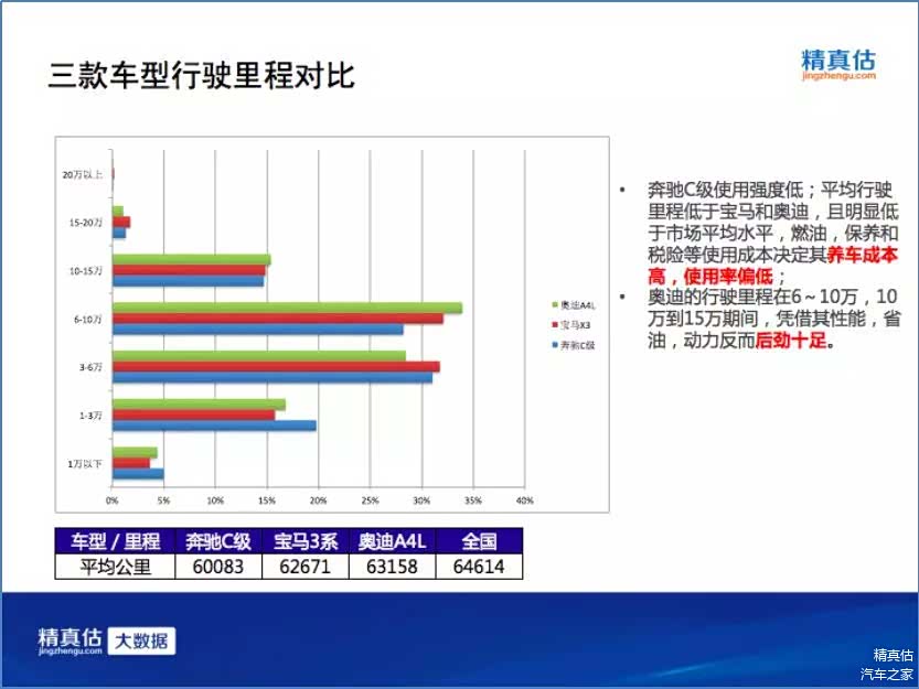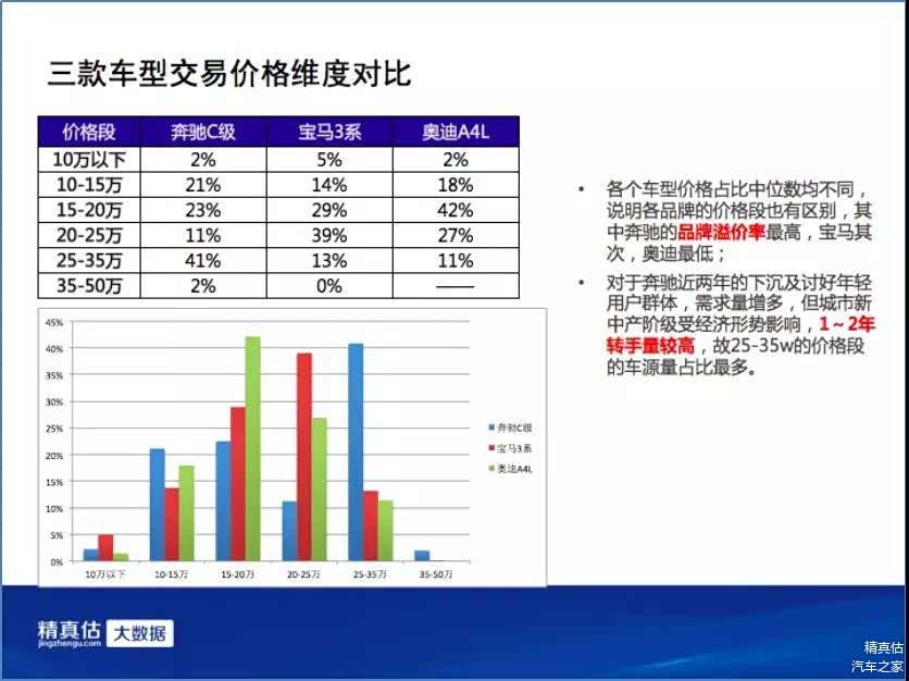 奔驰的41%集中在25万~35万;宝马3系的39%集中在20万~25万;42%的奥迪集中在15万~20万之间,这说明奔驰的品牌溢价率最高,宝马其次,奥迪最低。