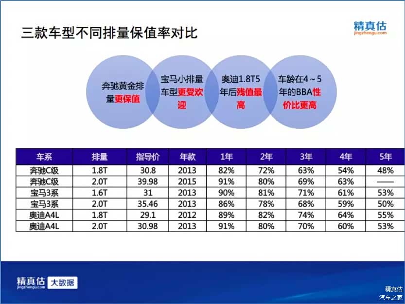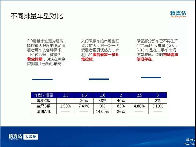 2.0作为黄金排量,最大限度的满足消费者的各种需求,在BBA中整体份额最高。反而宝马和奔驰的大排量车型,新车已不再生产,但市场上还有一定的份额,这也是品牌溢价能力的优势。