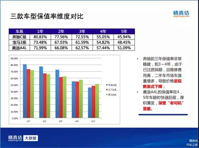 从保值率的计算方式来看,当期交易价格与市场指导价的比值。奔驰在前三年的保值率相对稳健,高达72%,但由于三年后质保期已过,零件的维修费用增高,导致4~5年后很多车主急于换手,车源量增多,保值率下降。