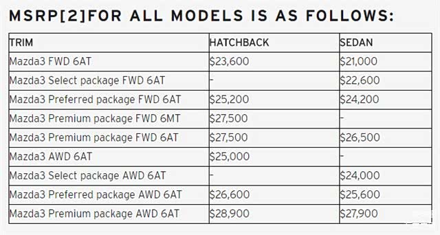 不过有一点非常奇怪,美版全新马自达3三厢版(Sedan)比两厢版(Hatchback)售价便宜了2600美元,差不多是了18000元人民币,这又怎么解释?