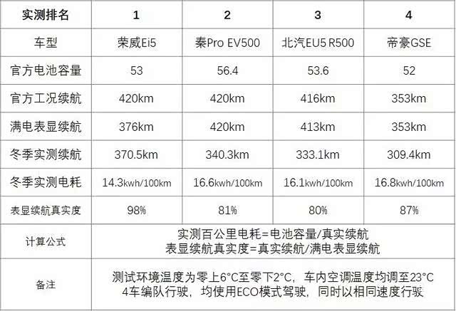 经过长途跋涉,最终实测的续航结果也顺利产生。荣威Ei5历时9小时40分,总里程数为 370.5公里,电量耗尽,平均能耗为14.3kwh/百公里;比亚迪秦PRO历时9小时,总里程数为340.3公里,百公里能耗为16.6kwh/百公里;北汽EU5历时8小时20分,总里程为333.1公里,实际测算百公里能耗为16.1kwh/百公里;帝豪GSe,全程历时7小时20分,总里程为309.4公里,平均能耗为16.8kwh/百公里。通过这次实际驾驶的最终结果显示,四款车型在冬季续航挑战表现都是还可以的,其中荣威Ei5以较为突出的优势,续航能力不愧为电动车中的“金霸王”的称号。