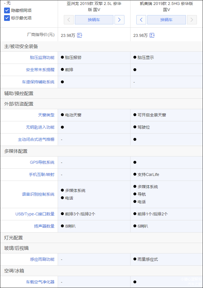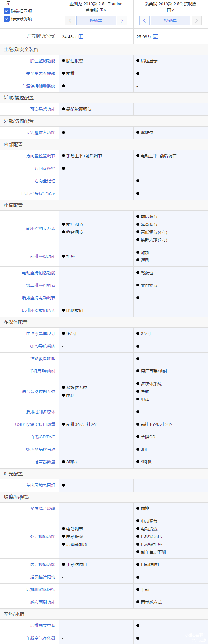 2.5L高配版车型方面,官方售价24.48万元的亚洲龙2.5L Touring尊贵版相比25.98万元的凯美瑞2.5Q旗舰版,在配置上多出了车道保持辅助系统、AVS自适应可变悬架系统、方向盘换挡、车内环境氛围灯等;凯美瑞的优势在于多出了车载空气净化器、雨量感应式雨刷、后排独立空调、后排遮阳帘、自动防眩目车内后视镜、后视镜记忆、JBL音响、GPS导航、道路救援呼叫、后排座椅电动调节、电动座椅记忆、前排座椅通风、HUD抬头数字显示、方向盘记忆等。价格更高的凯美瑞在舒适性配置方面更占优,亚洲龙的卖点依然在于底盘和主动安全配置。如果您对舒适性配置没有特别高的要求,那小猫认为亚洲龙更有优势。