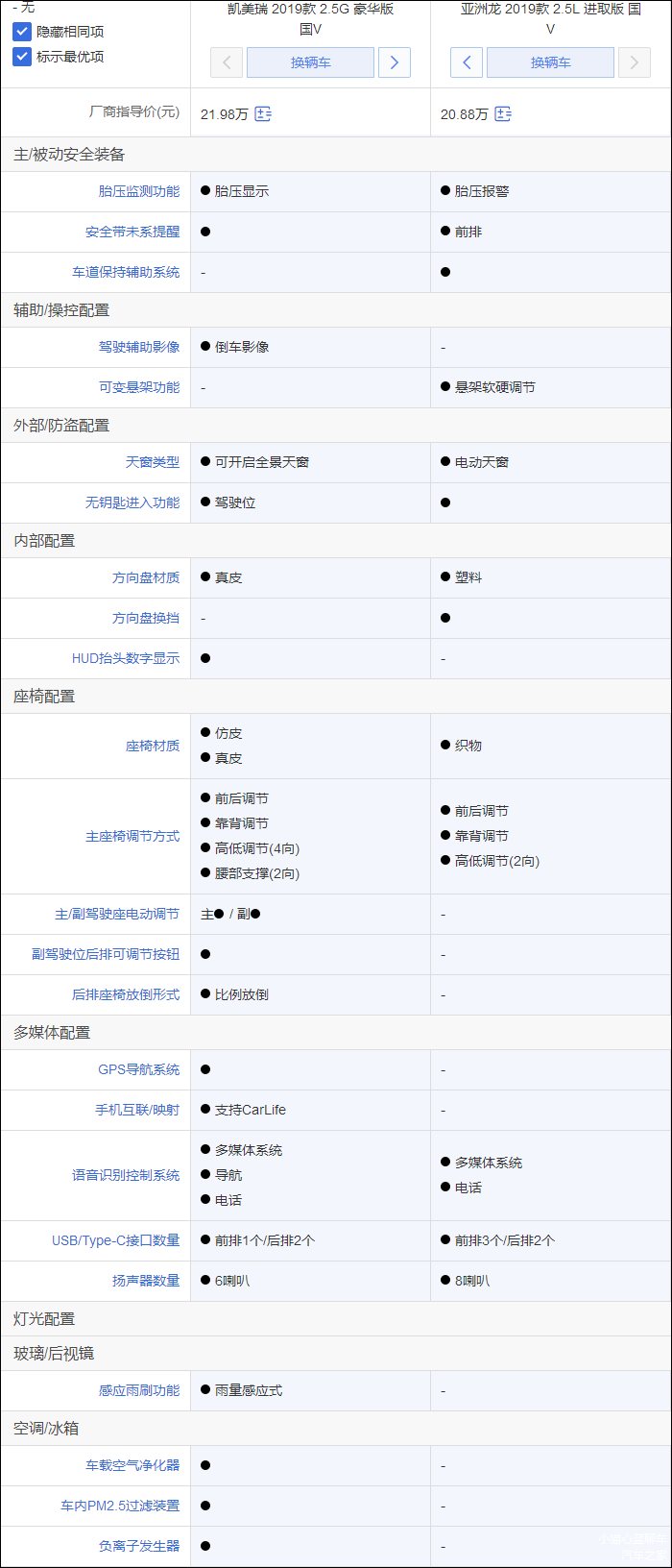 因为目前一汽丰田亚洲龙暂无2.0L车型推出,所以它与凯美瑞之间的对话仅限于20万元以上市场。官方售价20.88万元的2.5L进取版是亚洲龙的入门级车型,相比21.98万元的凯美瑞2.5G豪华版,其优势是多出了车道保持辅助系统、AVS自适应可变悬架系统、方向盘换挡等配置;凯美瑞的优势是多出了车载空气净化系统、雨量感应式雨刷、手机映射互联、GPS导航、前后泊车雷达、倒车影像、前排座椅电动调节、副驾驶位后排可调节按钮、皮质座椅、HUD抬头数字显示等配置,且天窗从普通天窗升级为全景天窗。就配置选择而言,凯美瑞更注重舒适性,亚洲龙的优势在于底盘和主动安全性。考虑到亚洲龙价格低1.1万元且空间更大,小猫认为其综合竞争力更强。让人略感不解的是,亚洲龙2.5L进取版居然不能提供倒车雷达这个在几万元低端车型上都是标配的实用配置。