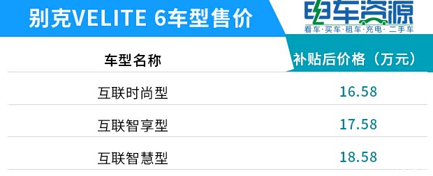 4月15日,电车资源了解到上汽通用别克 VELITE 6(图片 | 参数 | 询价)正式上市,补贴后售价为16.58-18.58万元。新车定位于一款MAV多功能运动型轿车,综合续航里程为301km。