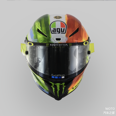AGV原厂的照片,让我们欣赏一下意大利穆杰罗站的罗西彩绘头盔吧。本次彩绘使用手绘风格呈现,依旧委托Drudi Performance工作室进行设计与彩绘,负责人Aldo Drudi,将头盔分为三区块并以意大利国旗的绿、白、红三色呈现,透过粗犷的笔刷方式彩绘于AGV Pista GP R上头。