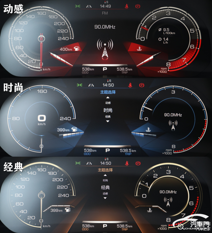 仪表盘采用12.3英寸全液晶仪表,支持时尚、经典、动感三种主题切换,不过三种模式之间更多的是颜色的变化,具体显示格式并无明显变动。同时,在主题切换时中控屏主题颜色也会相应改变。
